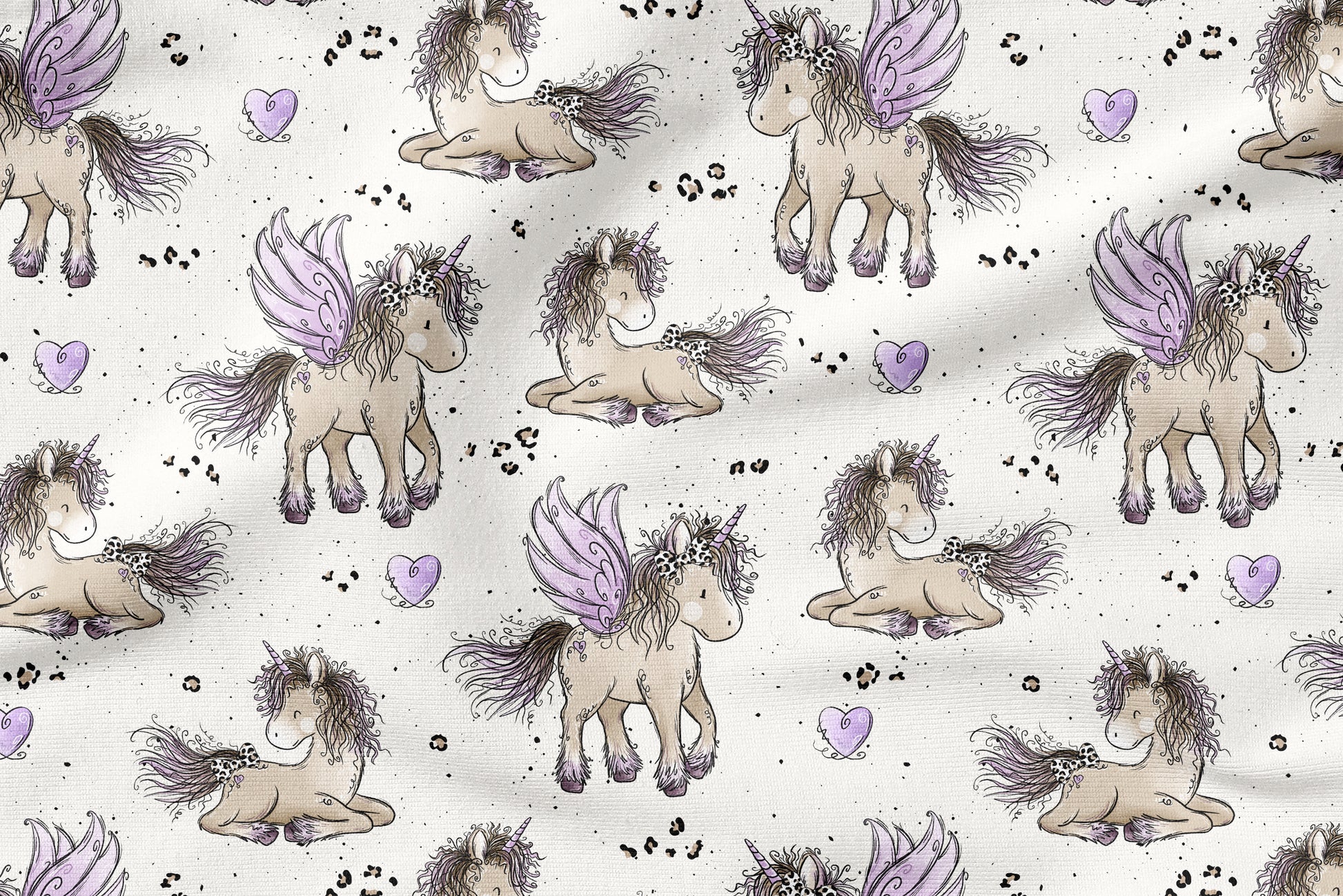 Einhornzeit Creme verbindet märchenhafte Einhörner mit zarten Flügeln, verspielten Herzdetails und feinen Leo-Akzenten auf einem warmen, cremigen Hintergrund.