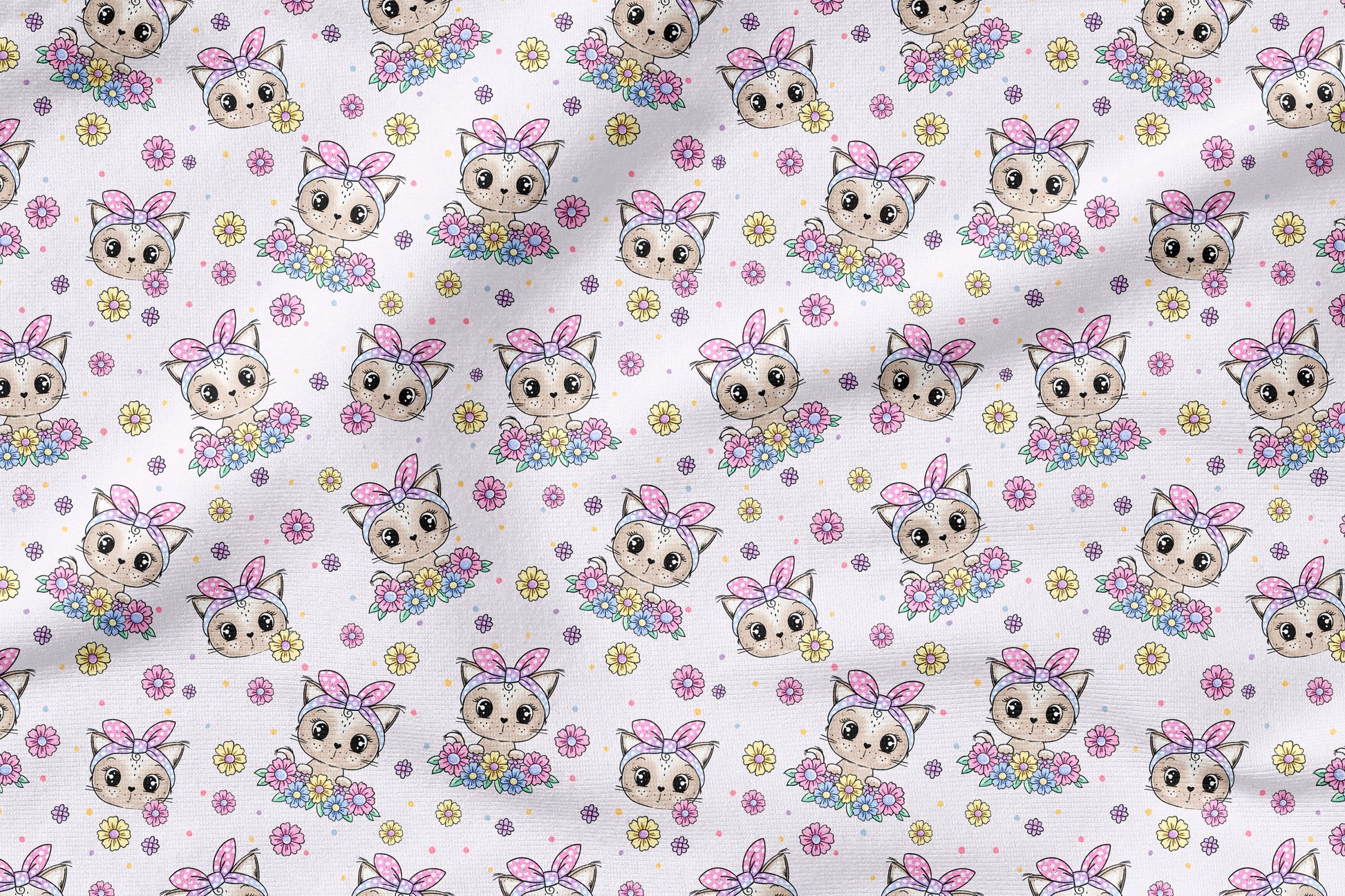 Kitty Flower – Flieder ist ein zauberhaftes Stoffdesign voller Charme und Leichtigkeit. Süße Kätzchen mit großen, glänzenden Augen und gepunkteten Schleifen schauen neugierig zwischen bunten Blumen hervor. Zarte Pastellblüten in Rosa, Gelb, Blau und Flieder tanzen auf einem sanften fliederfarbenen Hintergrund und verleihen dem Stoff eine fröhliche, verspielte Ausstrahlung.
