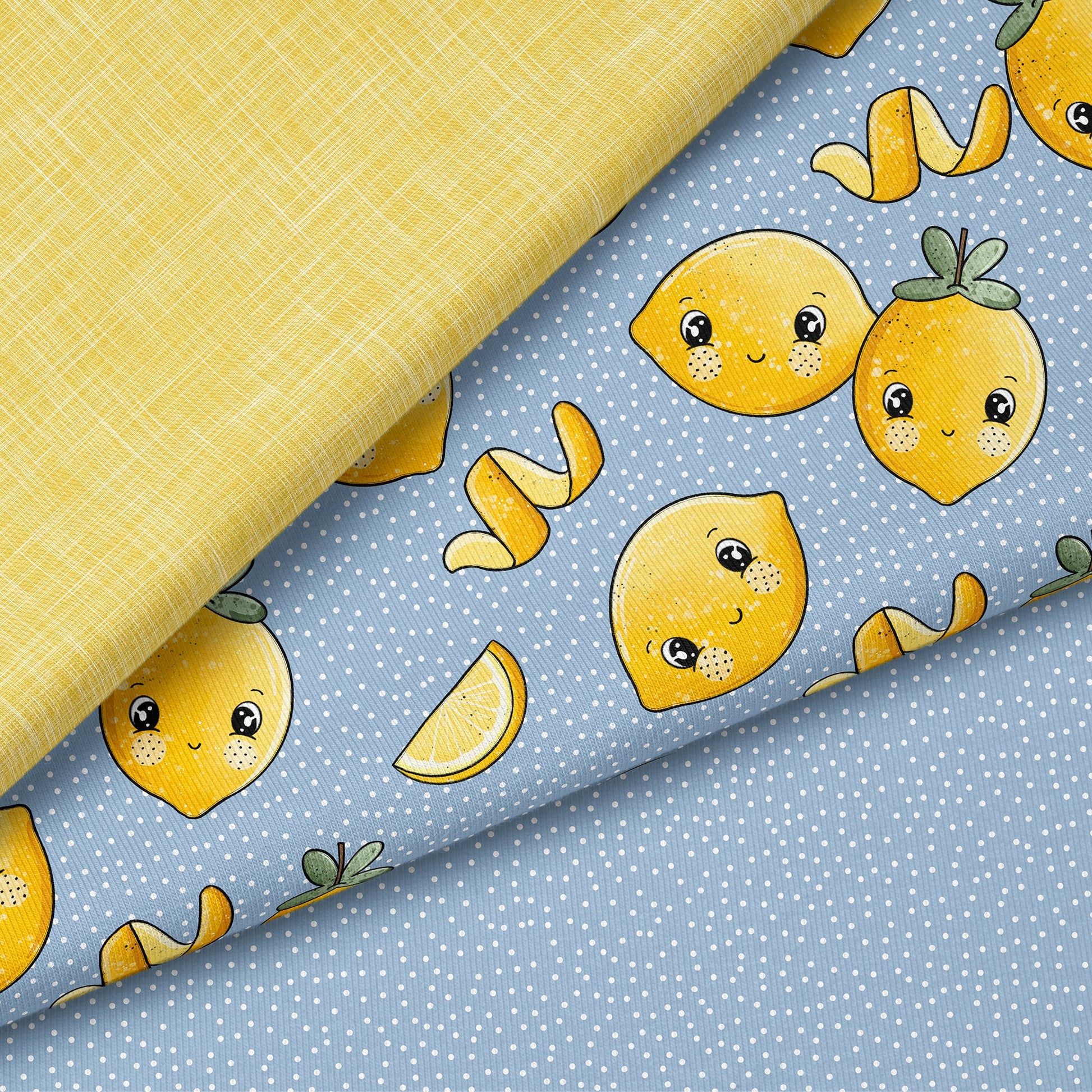Dieses fröhliche Stoffdesign versprüht pure Sommerfrische. Süße Zitronen mit liebevollen Gesichtern, kleine Zitronenspalten und verspielte Details verteilen sich harmonisch auf einem hellblauen Punkt-Hintergrund. Die Kombination aus strahlendem Gelb und sanftem Blau wirkt leicht, modern und wunderbar kindgerecht.