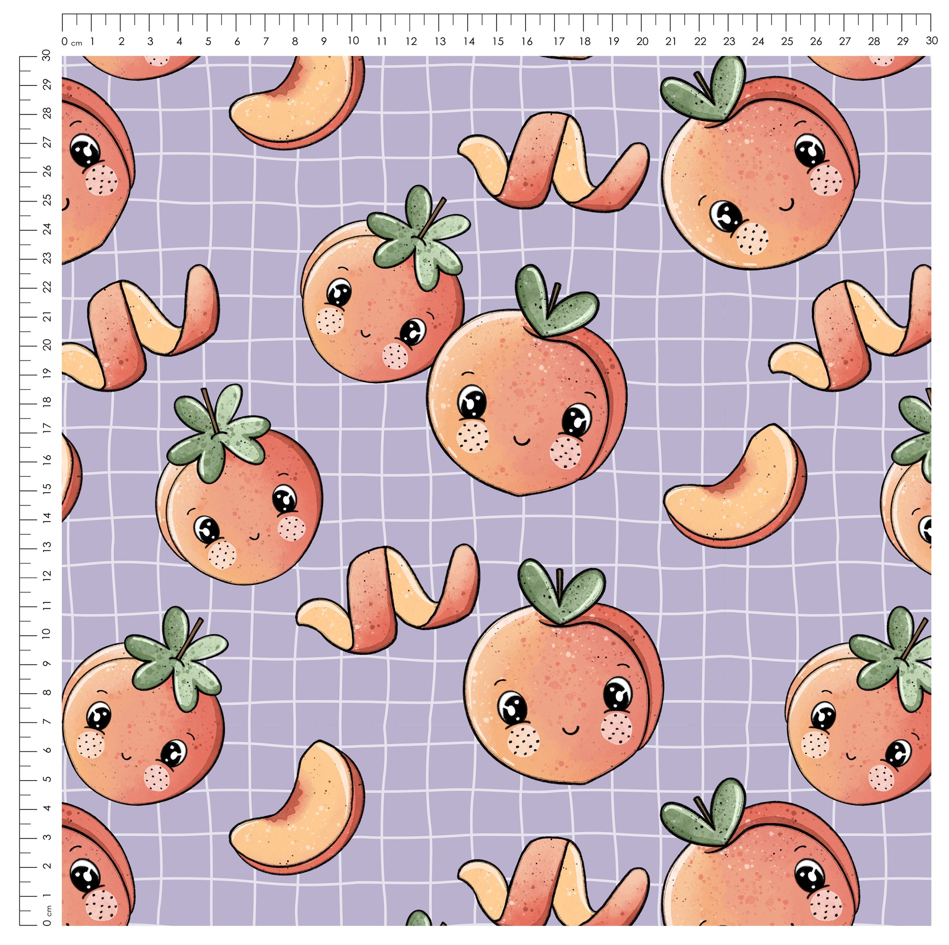 Dieses fröhliche Stoffdesign bringt gute Laune und Leichtigkeit in jedes Nähprojekt. Niedliche Pfirsiche mit süßen Gesichtern, ergänzt durch kleine Fruchtstücke, verteilen sich verspielt auf einem sanften lila Karomuster. Die harmonische Kombination aus warmen Pfirsichtönen und dem ruhigen Hintergrund macht den Stoff modern, kindgerecht und wunderbar zeitlos.