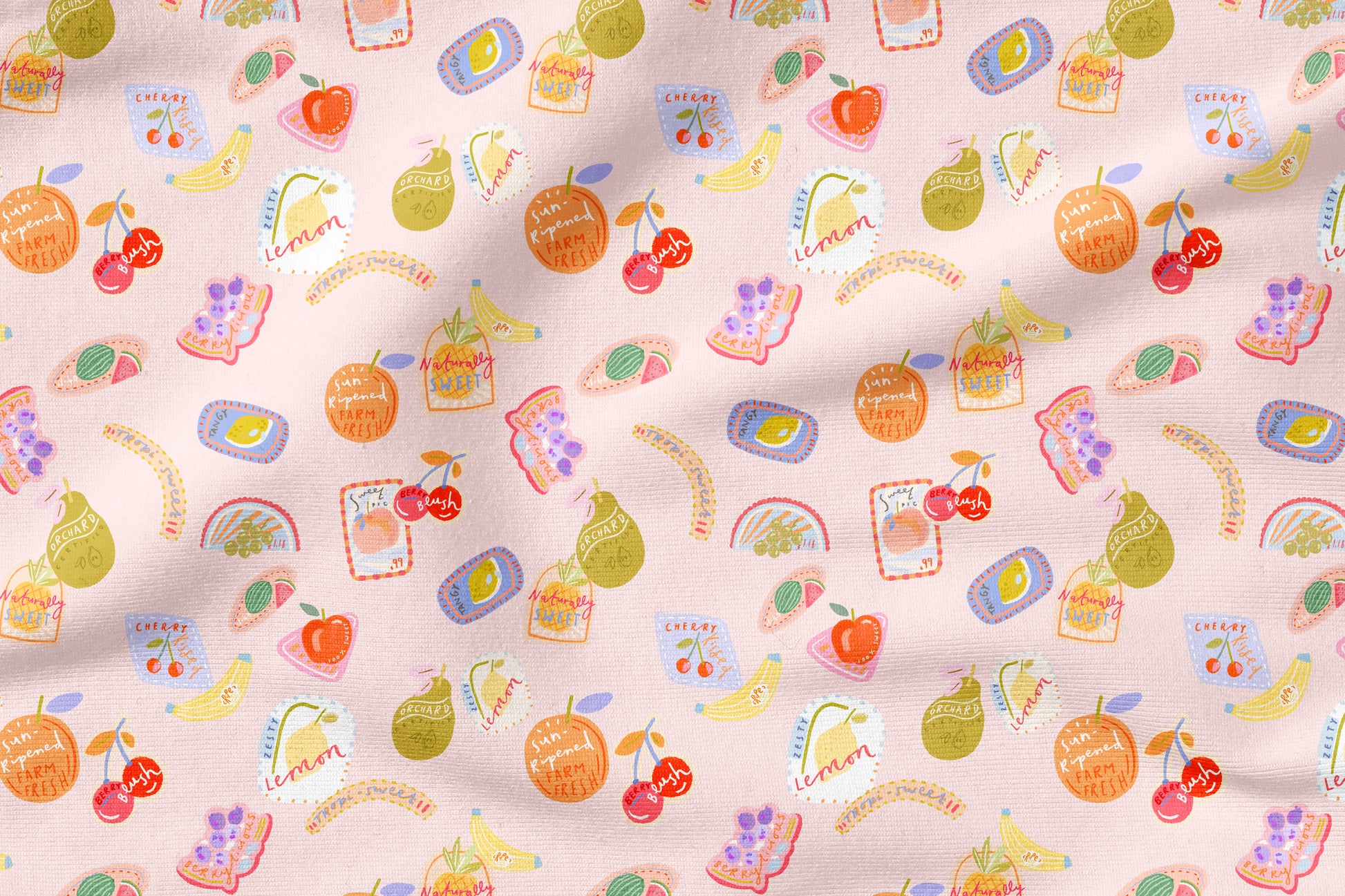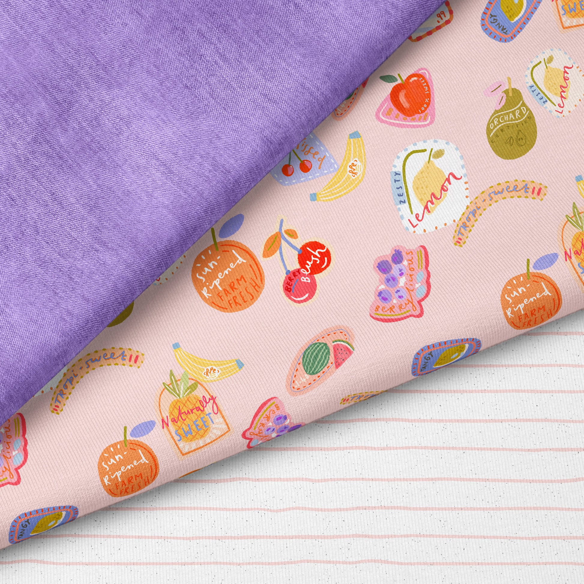 Sweet Picks in Rosa versprüht pure Frische und gute Laune. Bunte Frucht-Illustrationen, kleine Sticker-Elemente und handgezeichnete Schriftzüge wie „Naturally Sweet“, „Farm Fresh“ oder „Berry Fresh“ verteilen sich locker auf einem zarten rosafarbenen Hintergrund. Die Kombination aus soften Pastelltönen und verspielten Details verleiht dem Stoff einen modernen, kreativen Look mit Retro-Vibes.