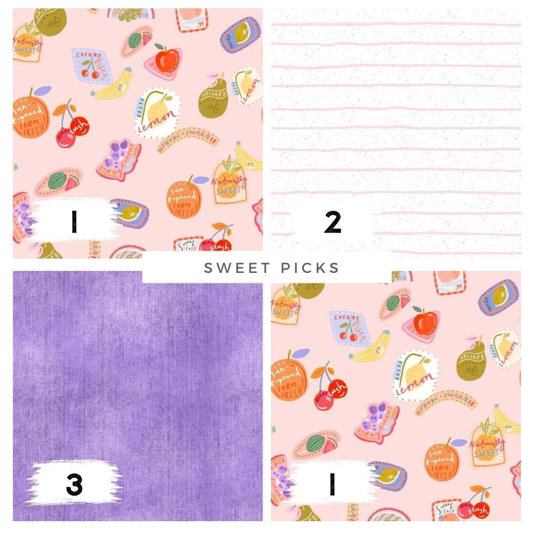 Dieses Design ist ein echter Hingucker und eignet sich perfekt für Kinderkleidung, Sommeroutfits, Shirts, Kleider, Leggings, Beanies, Accessoires, Taschen oder kreative Handmade-Unikate. Durch das gleichmäßige Allover-Muster kommt Sweet Picks sowohl auf kleinen als auch auf großen Nähprojekten wunderschön zur Geltung.