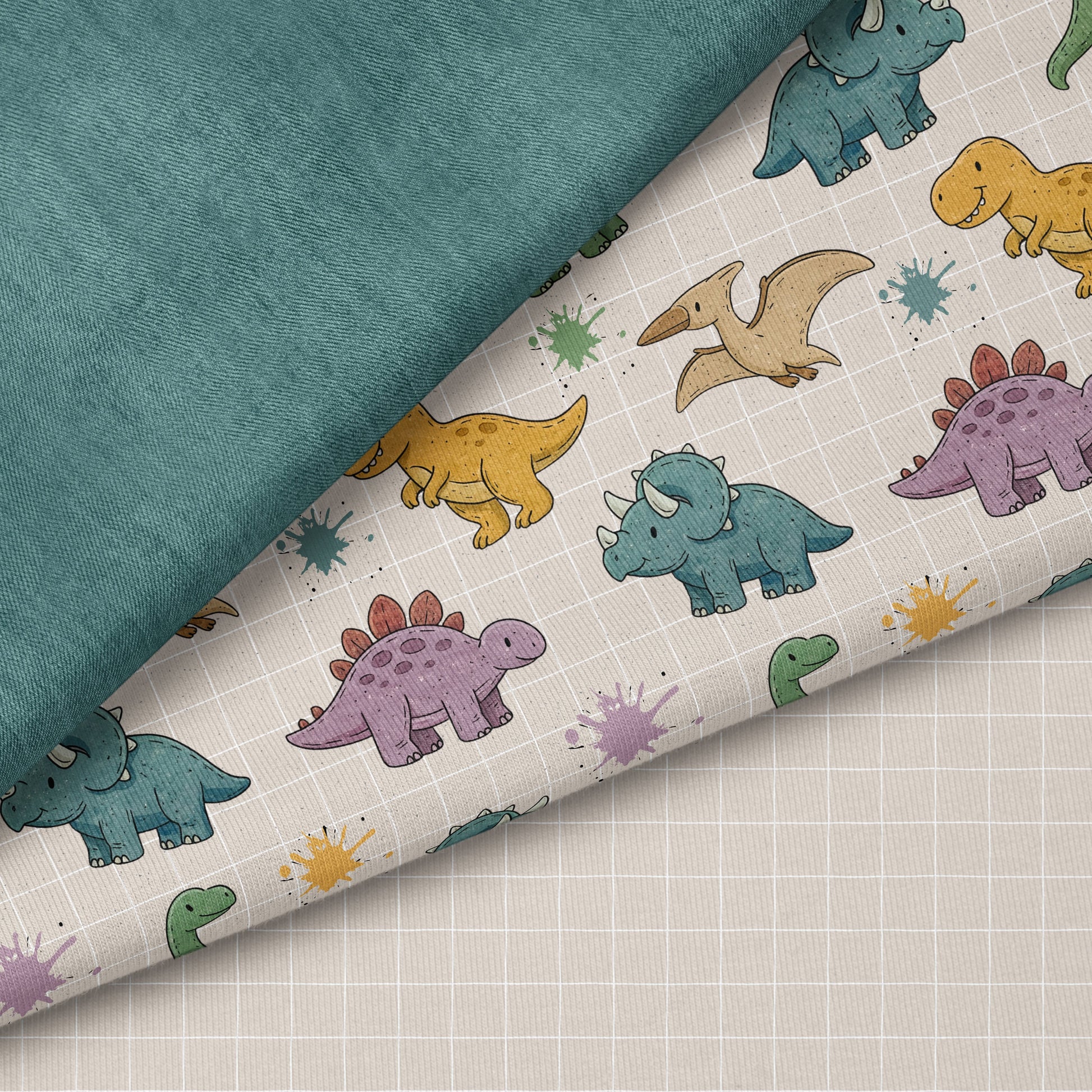 Dinotopia Grid ist ein liebevoll gestalteter Stoff für kleine Dino-Fans. Niedliche Dinosaurier wie T-Rex, Triceratops, Stegosaurus & Co. verteilen sich verspielt auf einem dezenten Grid-Hintergrund. Kleine Farbspritzer lockern das Design auf und verleihen dem Stoff einen modernen, kreativen Look – perfekt für Kinder, die Dinos lieben, aber ohne grelle Farben.