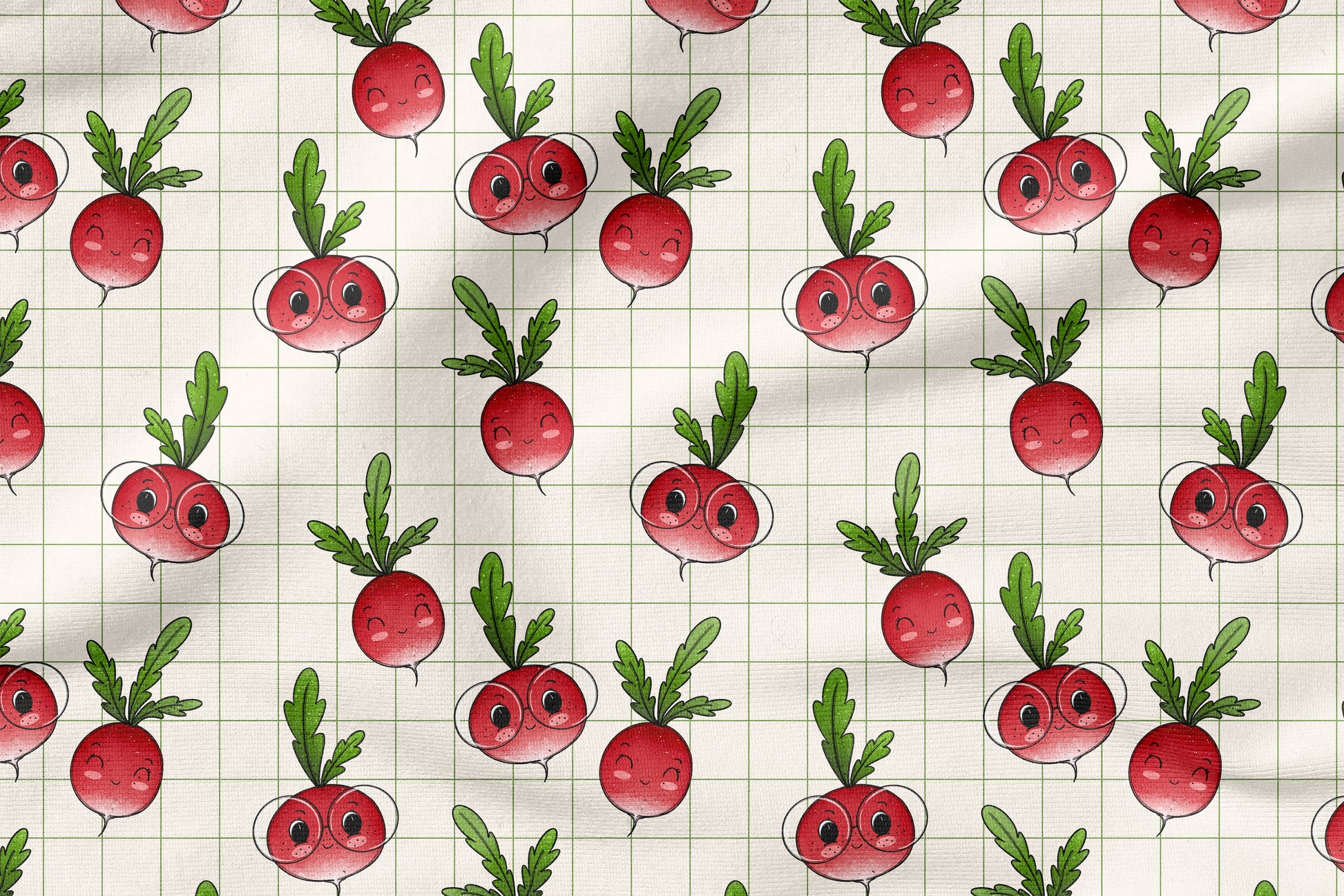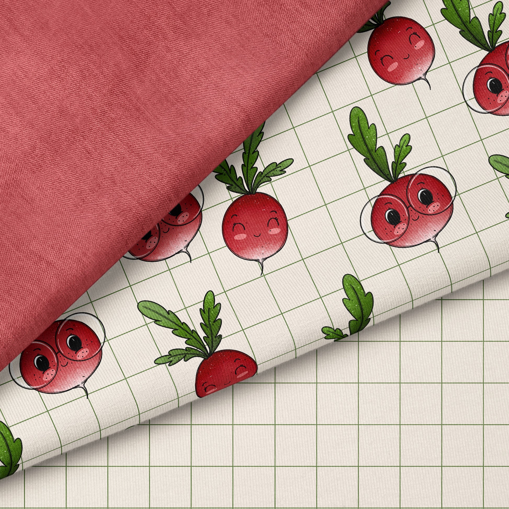 Radieschen Liebe ist ein fröhliches, modernes Stoffdesign mit süßen Radieschen-Motiven auf einem zarten, grafischen Hintergrund. Die kleinen Radieschen mit ihren freundlichen Gesichtern und satten Rot-Grün-Tönen bringen sofort gute Laune auf den Nähtisch und sind ein echter Hingucker für Groß & Klein.