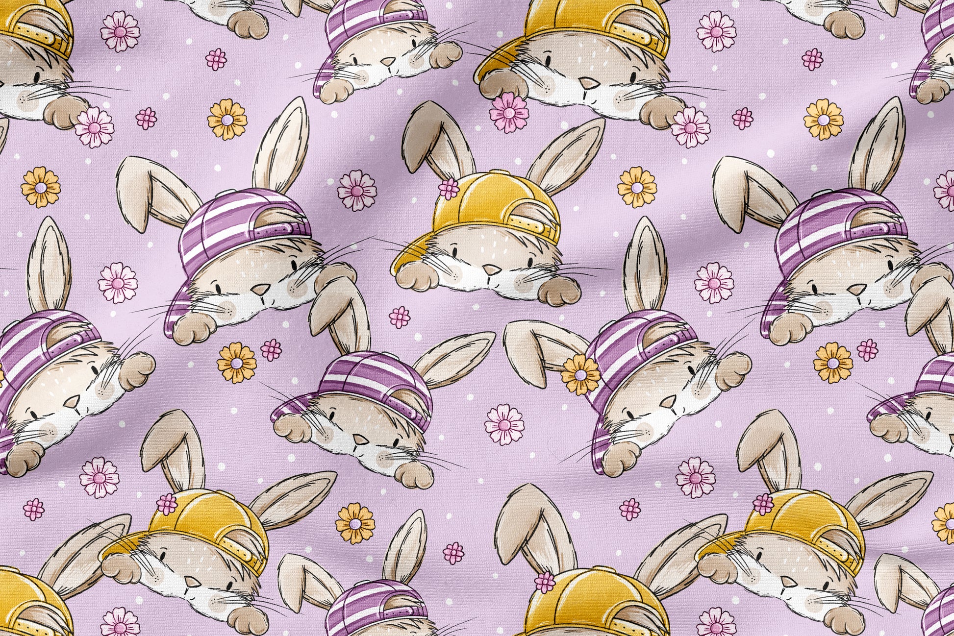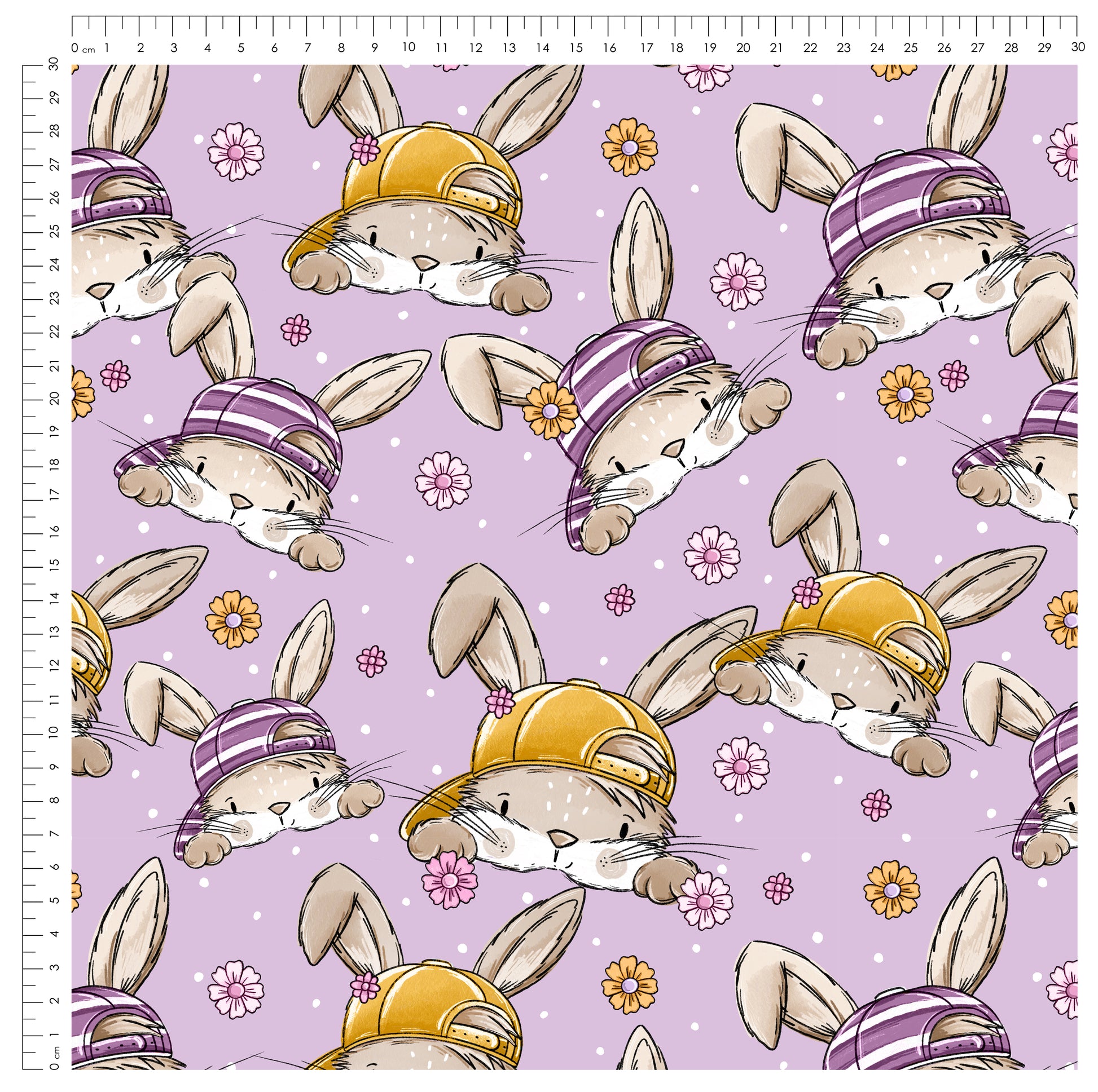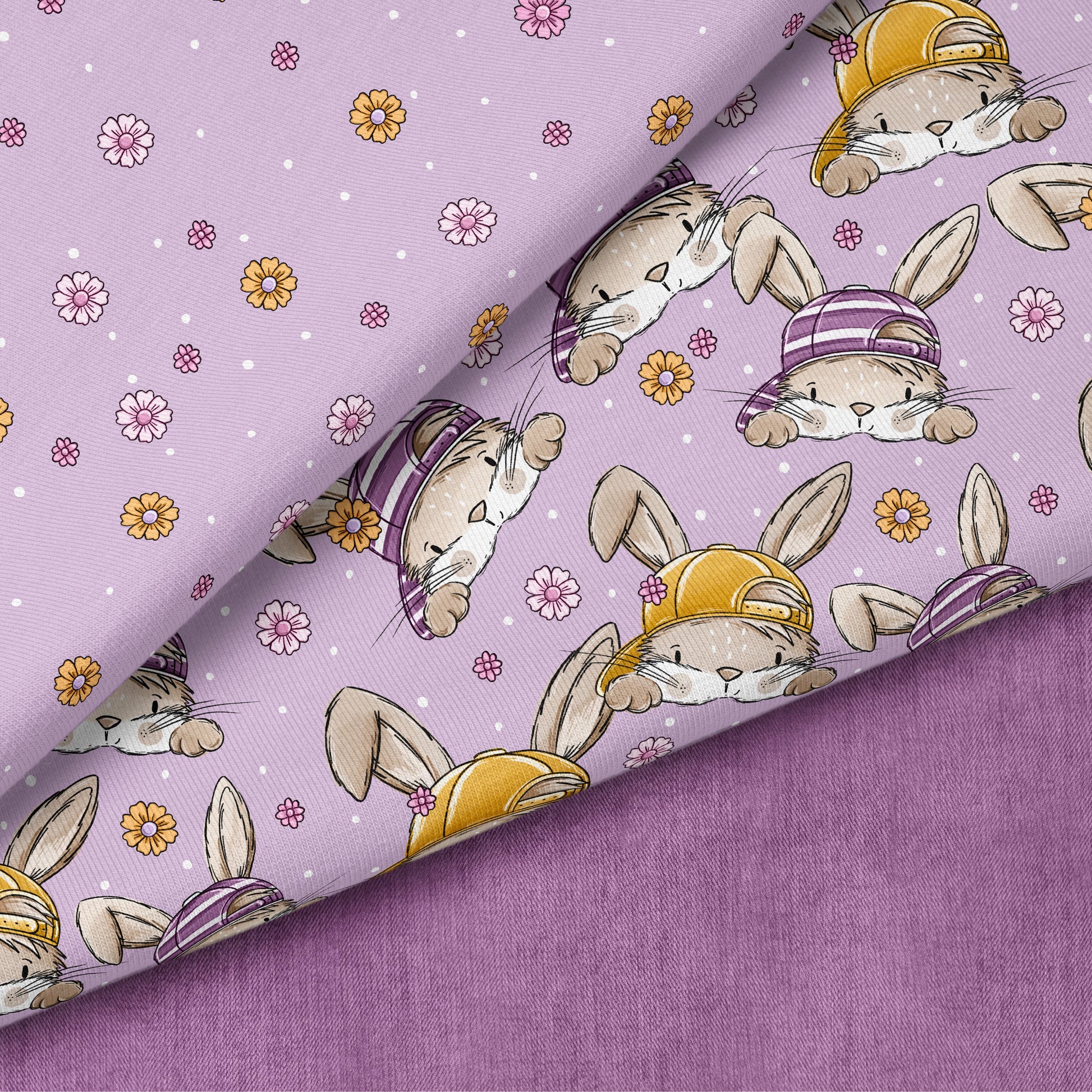 Skate Bunny Vibes Girl Flieder verbindet lässige Skater-Vibes mit einer extra Portion Süße. Die frechen Hasen mit Caps, kleinen Blumen-Details und dem soften Flieder-Hintergrund machen diesen Stoff zu einem echten Highlight für moderne Mädchenkleidung.