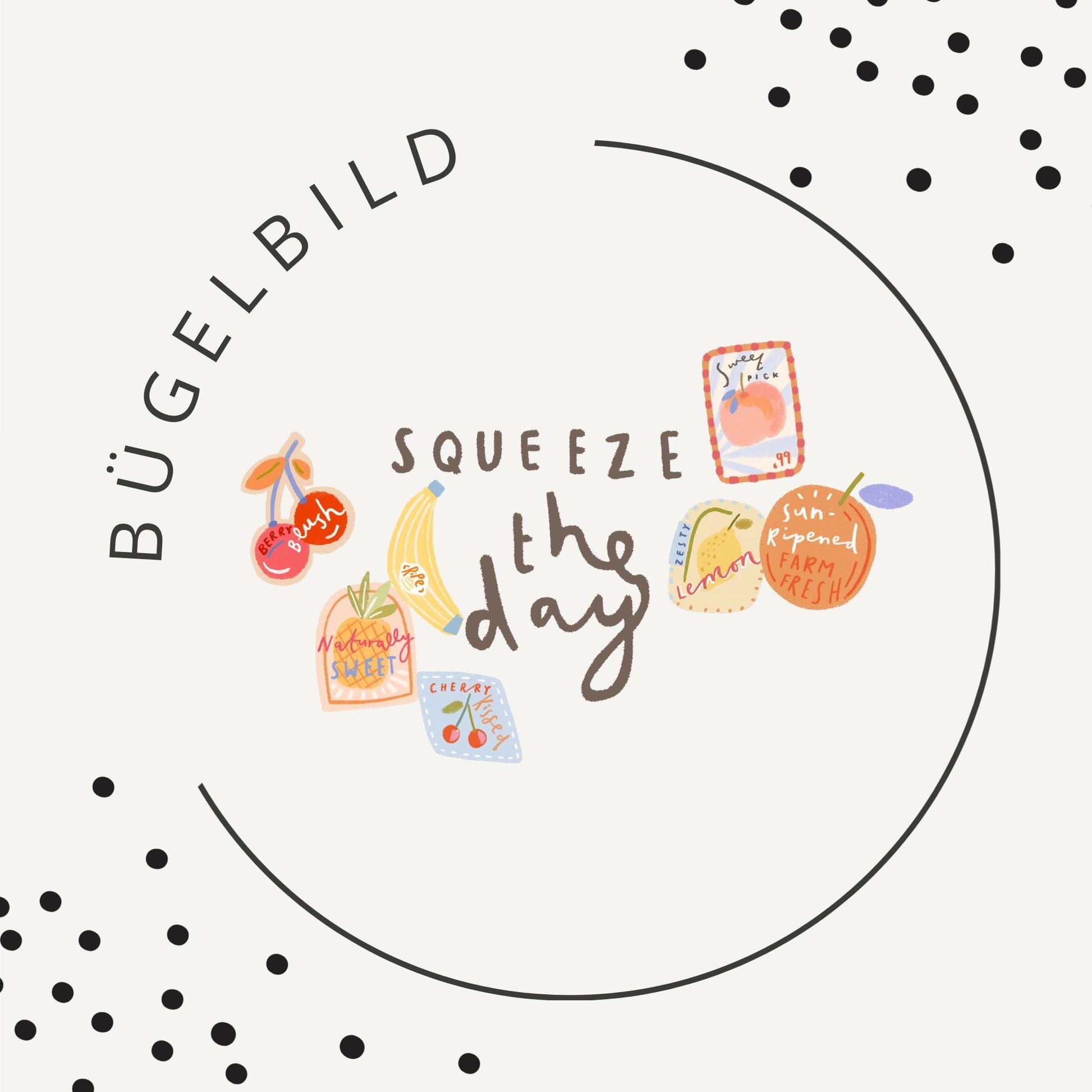 Das Bügelbild Sweet Picks vereint liebevoll illustrierte Früchte, kleine Etiketten und den handgeschriebenen Schriftzug „squeeze the day“ zu einem frischen, modernen Design. Die sanften Farben und der charmante Retro-Touch machen dieses Motiv zu einem echten Hingucker auf Kinderkleidung und Accessoires.